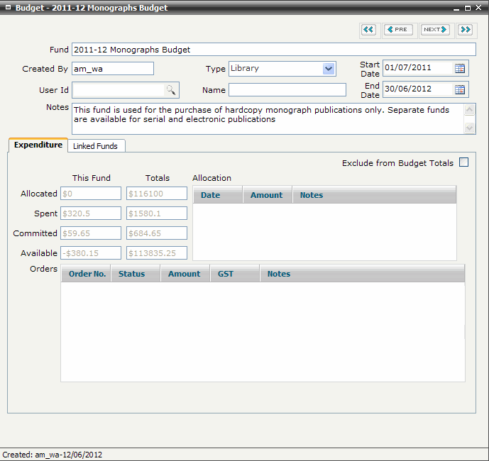 Check Exclude from Budget Totals if the Fund is managed separately from the overall Library budget. The Total column will disappear when the Exclude from Budget Totals checkbox is checked