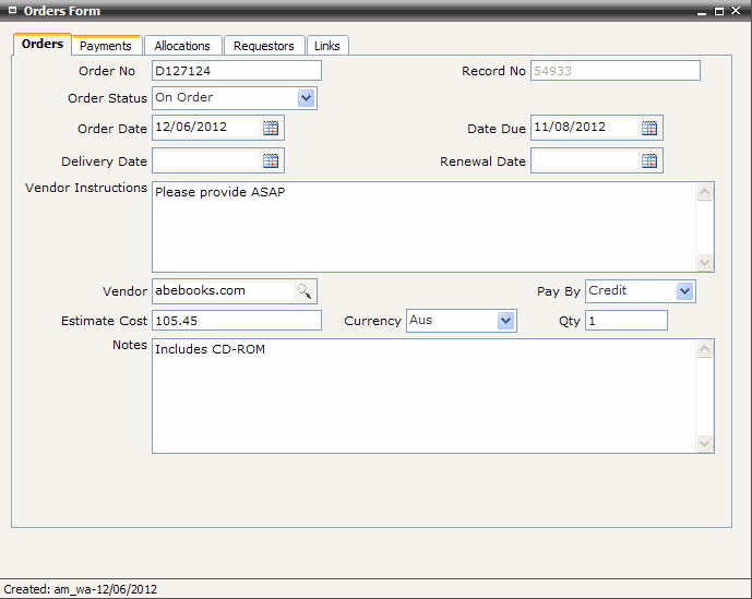 Order Status defaults to ‘On Order’. Select an alternative status option from the Order Status pop-up list if required