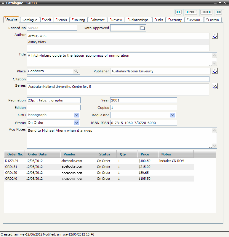 The system will generate a save confirmation prompt. Click YES to save the Acquisitions (Catalogue) record