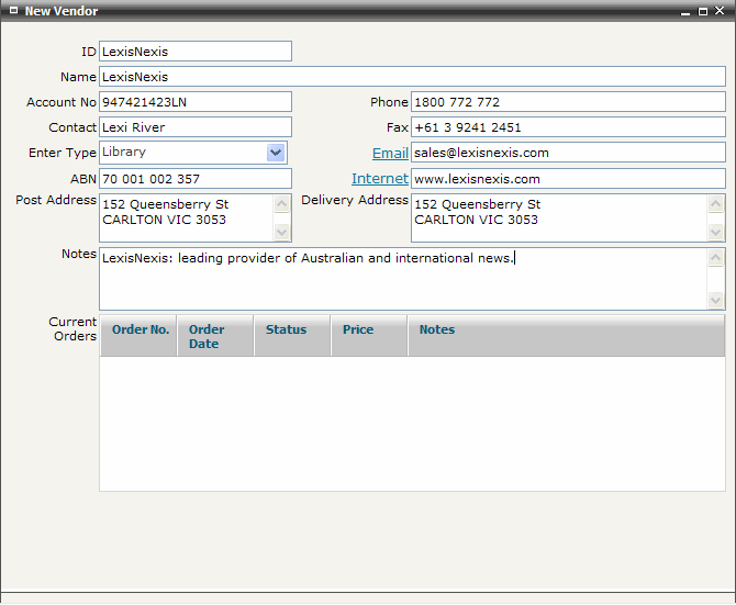 Enter the Australian Business Number and internal account number for the vendor in the ABN and Account No text boxes respectively (optional)