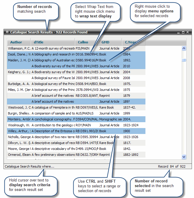 Right mouse click menu options to select all records, omit records from display and wrap the display of information on the Search Results screen