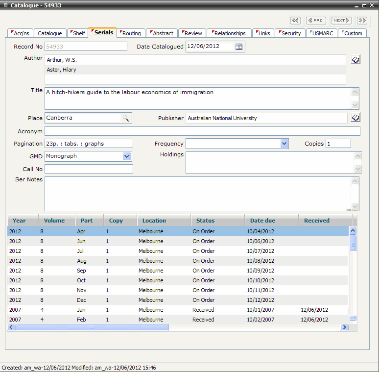 A summary list of all serial issues ordered and received associated with the catalogue record is displayed in the summary window at the bottom of the Serials tab screen.