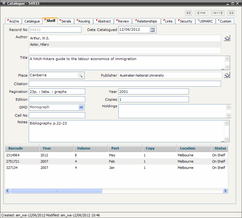 A summary list of all shelf items associated with the catalogue record is displayed in the summary window at the bottom of the Shelf tab screen.
