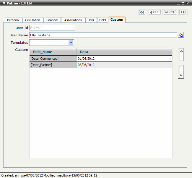 The Custom tab screen enables you to record additional data attributes that do not match standard Patron data entry structures.