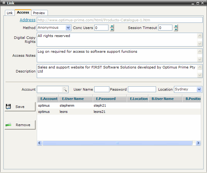 For Links where user names and passwords for individual users are stored, these can be catalogued in the grid. The magnifying glass icon in the Account field performs a lookup of all Patron records. If you wish to link a login with a specified patron record, then enter part of the patron’s User ID in the Account field, then click the magnifying glass icon. Alternatively, click the magnifying glass icon when the Account field is empty, to view a complete list of all patron records. Double click on the Patron record to select, and this will place the User ID into the Account field. Doing this will create a link with the Patron record, and the B.User Name and B.Position fields will be populated from the Patron record.