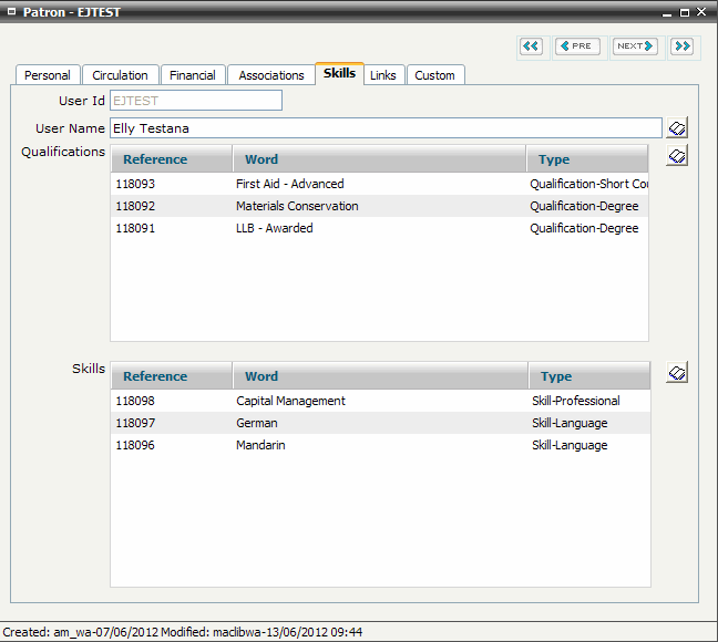 Qualifications and skills recorded on the Skills tab screen are selected from an authority list or taxonomy of qualifications and skills.