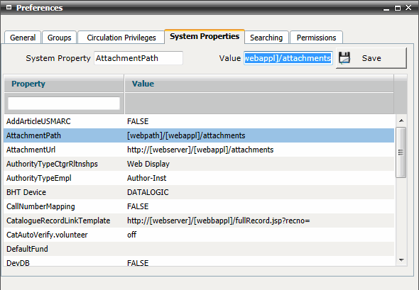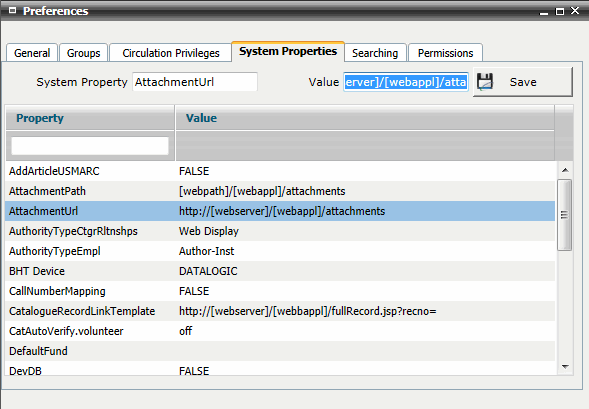 Click in the Value field. If this field is blank or incorrect enter the correct URL location for the /attachments folder in your OPAC. This path may need to be supplied by FIRST in the case of Hosted systems or by your IT for those systems hosted in-house. The standard pattern for the AttachmentURL is as follows: